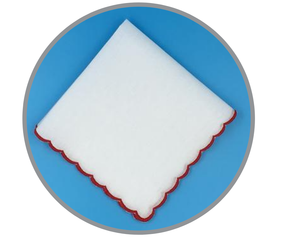 Simple and elegant 100% white cotton handkerchief with red satin scalloped edge.