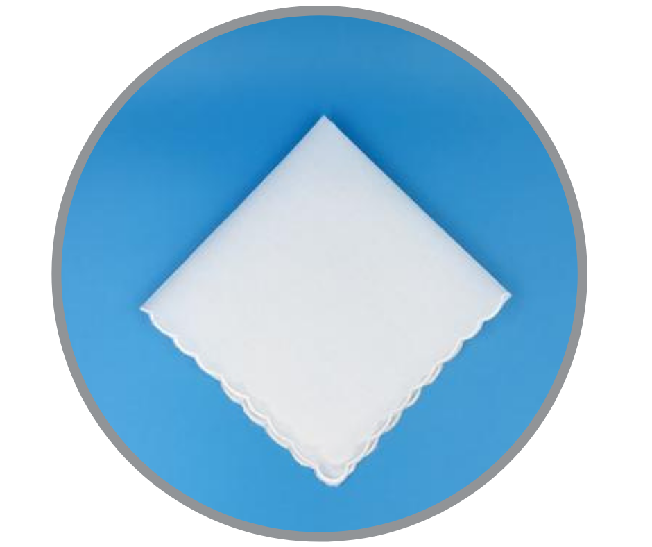 One of our most popular handkerchiefs. Simple and elegant 100% cotton handkerchief with white satin scalloped edge. Makes a beautiful gift for any occasion.